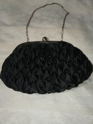 Elegante bolso de fiesta con un diseño sofisticado y una cadena metálica. - Material: Satén - Color: Negro - Cadena: Metálica plateada
