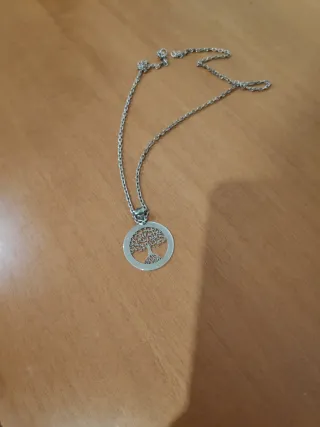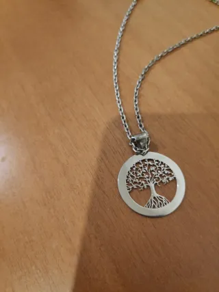 Colgante y Cadena de Plata "Árbol de la Vida". Representa la interconexión de todas las formas de vida, el crecimiento espiritual y la relación entre el cielo y la tierra. -Diseño: Cuenta con un diseño calado de aproximadamente 23 mm a 24 mm de diámetro. -Material: Colgante y Cadena Plata de ley 925. -Estado: Muy Bueno. Prácticamente Nuevo.