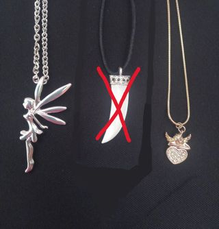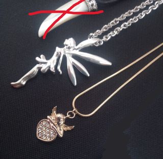 Bonitos colgantes de bisutería con sus respectivas cadenas. Vea las fotos para ver la parte de atrás de ambos colgantes, no han perdido brillo. A ELEGIR el que más guste. 5€ la unidad. - Colgante de hada plateada. Es bastante largo, por debajo del pecho. - Colgante de ángel dorado con corazón de brillantitos.