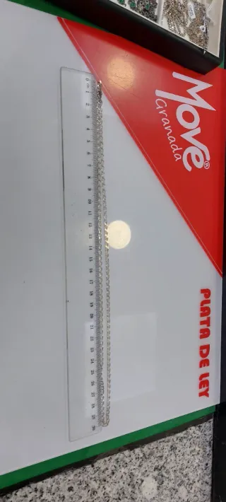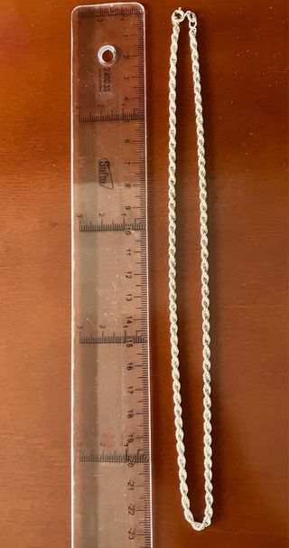 Cadena de 40cm de Plata de Ley 925. Elegante y Clasica de Plata auténtica. Hay que medirse el cuello antes de comprar porque en las fotos parece más gruesa pero es CORTA y FINA. Está fotografiada sobre un metro para que la midan bien antes de comprar, por favor. Ideal para lucir colgantes como se muestra en las últimas fotos.