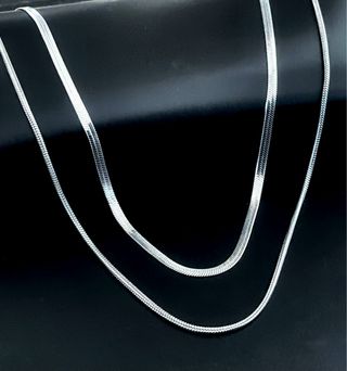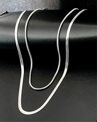 Conjunto de dos collares tipo cadena, elaborados en acero inoxidable. - Diseño liso y elegante. - Material duradero y resistente. - Medidas: Cadena serpiente 50 cm largo. 0,3 cm ancho. Cadena redonda 55 + 5 cm largo. 0,2 cm ancho.
