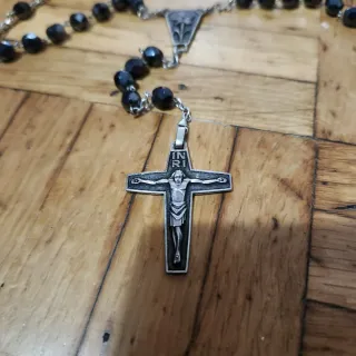 Elegante rosario con detalles en plata y cuentas negras. El crucifijo presenta la inscripción INRI. - Crucifijo de plata con figura de Cristo. - Cuentas facetadas de color negro. - Cadena de plata.