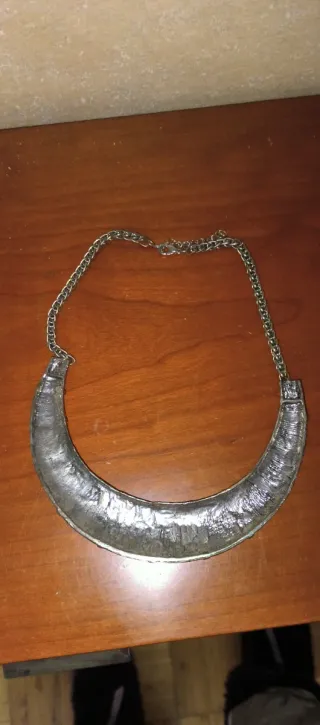 Collar de estilo tribal con un diseño curvo y detalles en relieve. La cadena es ajustable para mayor comodidad. - Diseño curvo. - Cadena ajustable. - Acabado metálico.