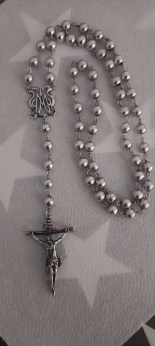 Elegante rosario elaborado en plata de ley 45 cmt de largo - Diseño con cuentas esféricas. - Incluye medalla con símbolo. - Crucifijo detallado.