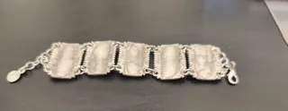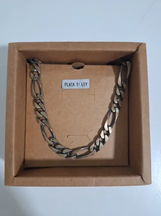 Pulsera de cadena estilo Fígaro (3+1) en plata de primera ley 925. Acabado envejecido/pavonado con contrastes oscuros en los eslabones que realzan el relieve y le aportan carácter industrial. Excelente estado de conservación. El tono oscuro es el acabado original (plata oxidada), no suciedad ni desgaste. Se entrega con su soporte de cartón original “Plata 1ª Ley”. Punzón 925 visible junto al cierre. • Peso: 19,14 g (plata maciza) • Longitud: 21 cm • Ancho: 7–8 mm aprox. • Cierre: mosquetón reforzado