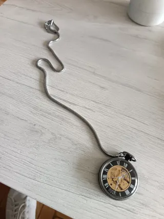Elegante reloj de bolsillo con cadena. - Diseño clásico con esfera negra y detalles plateados. - Mecanismo visible a través de la esfera. - Incluye cadena a juego.