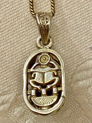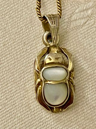 Collar con un colgante de plata con forma de escarabajo. El diseño combina detalles en tonos dorados y plateados, con piedra luna. Collar cadena con colgante de escarabajo con piedra luna. Comprado en Egipto. Mide 23 mm de largo con la anilla de fijación y 15 mm sin ella, incluyendo el medallón. Su ancho es de 10 mm. Nuevo a estrenar.