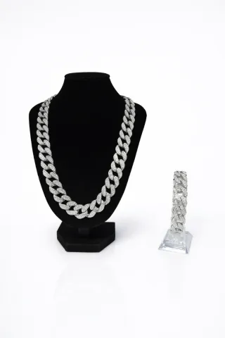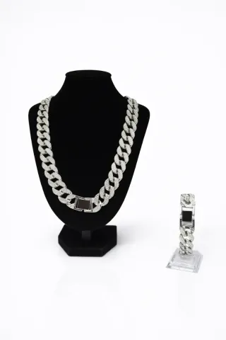 Elegante conjunto de cadena y pulsera estilo cubano, adornado con brillantes incrustados. - Diseño de eslabones gruesos. - Acabado plateado reluciente. - Ideal para complementar tu estilo. - Material: Acero inoxidable. - Nuevo. - Medida 60cm de cadena y 20 cm la pulsera
