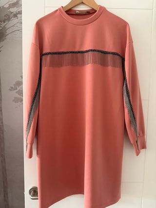 Vestido de manga larga en color rosa salmón, coral con un diseño moderno. - Detalle de cadenas plateadas en el pecho. - Adorno de cadenas plateadas en las mangas. Tejido elastico Marca asos Talla 40 Hombros 54cm Sisa 55 cm Largo manga 50 cm Largo vestido 90 cm Super original