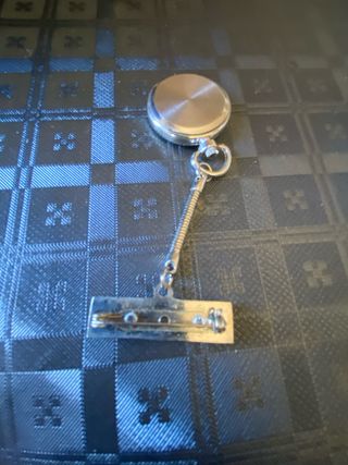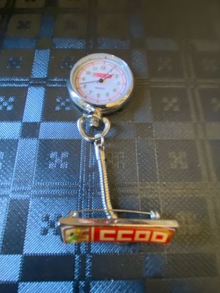 Reloj de bolsillo o colgante con un práctico alfiler para sujetarlo. - Diseño con esfera blanca y detalles en rojo. - Cadena plateada para colgar. - Adorno en la parte inferior con texto 'CCDD' y un dibujo.