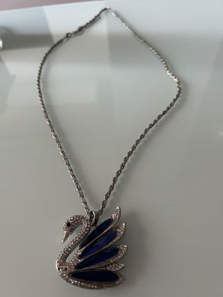 Elegante colgante con forma de cisne, adornado con detalles brillantes. - Diseño de cisne. - Cadena plateada. - Cristales de color azul.