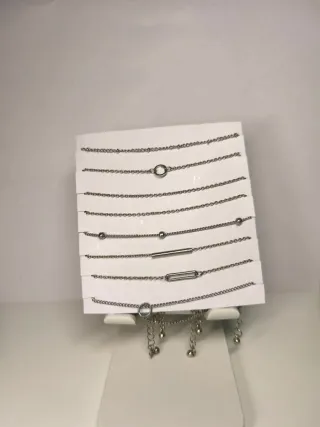 Tobilleras de bisutería en color plata. Son 8 en total, con distintos diseños. Están nuevas, nunca se han usado. No se de qué metal están hechas. - Cadena fina con detalles. - Incluye tobilleras con colgantes. - Estilo minimalista y moderno.