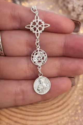 🔮 Collar Triple Amuleto Protector – Plata de Primera Ley 925 🔮 🛡️ ¿Qué protege este triple amuleto? • Protección frente a energías negativas y malas influencias • Bloqueo de envidias y mal de ojo • Fuerza espiritual y equilibrio • Apoyo en momentos difíciles y causas complicadas (San Judas Tadeo) • Escudo energético potente (Tetragrámaton + Nudo de Brujas) 💍 Ideal para llevar a diario como amuleto personal o para regalar con intención. Medida cadena: 40cm + 5cm de alargue, da hasta 45cm. Medidas: Nudo de brujas de 16 mm, el Tetragrammaton de 10mm, San Judas Tadeo 11mm. Medida general: 51 x 16 mm. Solo envíos. Somos tienda onl