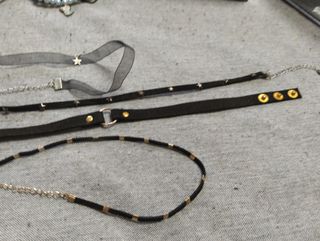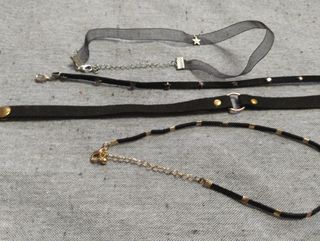 Conjunto de cuatro chokers de estilo variado. - Choker de cinta de organza negra con estrella. - Choker de cadena plateada con detalle. - Choker de cinta negra con tachuelas. - Choker de cinta negra con hebilla y detalles dorados.