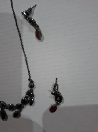 Conjunto de gargantilla y pendientes a juego. - Gargantilla con cadena fina y colgantes. - Pendientes a juego con detalles rojos. Lo entrego con una caja regalo plateada 281225sa banca si