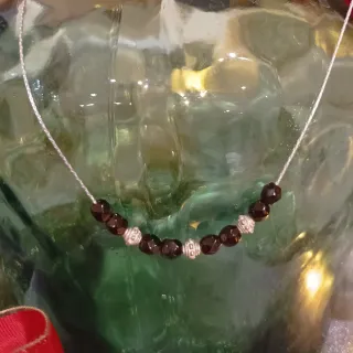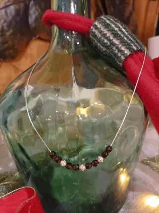 Elegante gargantilla de plata de ley. - Cadena tipo cordón fino semi rígido. - 8 bolitas facetadas en tono marrón. - 3 cuentas de plata con grabado. Medida de la cadena estirada incluido el cierre: 39,7cm.