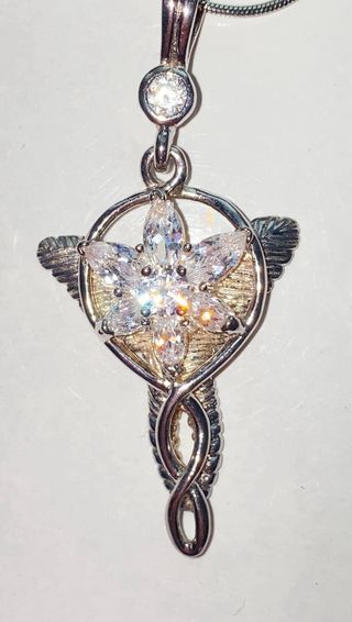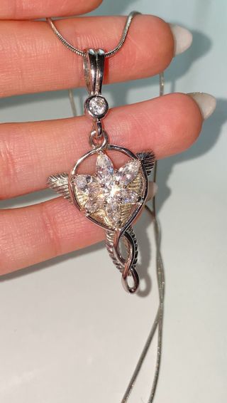 Elegante colgante de plata con un diseño floral adornado con circonitas brillantes. La cadena es fina y plateada. - Colgante con diseño de flor. - Detalles en circonitas. - Cadena de plata fina. Nuevo a estrenar ! Nunca usado! Colgante Arwen del "Señor de los anillos " (Podrá ver el vídeo del producto en IG:VINT_APOP )