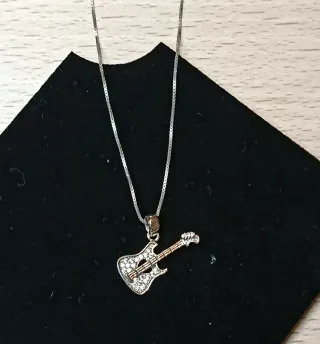 Colgante con forma de guitarra eléctrica, adornado con pequeñas circonitas que le dan un brillo especial. La cadena es de plata. - Nuevo sin etiqueta. - Diseño de guitarra detallado. - Cadena de plata tipo veneciana.