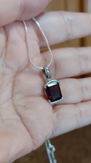 Elegante collar con un colgante de granate tallado en forma rectangular. La cadena y el colgante son de plata. - Colgante con piedra granate. - Cadena de plata.