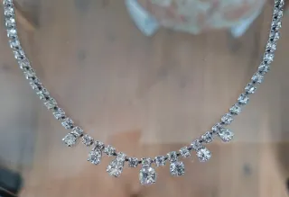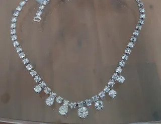 Elegante collar con un diseño delicado y brillante. Cadena con incrustaciones de pedrería. Colgantes con piedras de diferentes tamaños. Largo 41cms