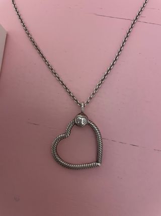 Elegante collar de la marca Pandora con un diseño de corazón. - Colgante en forma de corazón. - Cadena fina y delicada. - Acabado plateado. - Charm azul de regalo - Como nuevo