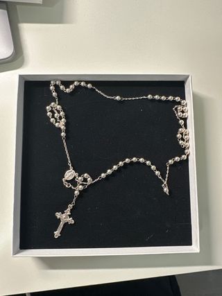 Elegante rosario de plata con un diseño clásico. - Elaborado en plata. - Incluye una medalla y una cruz detallada.