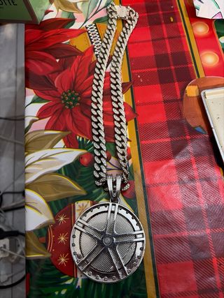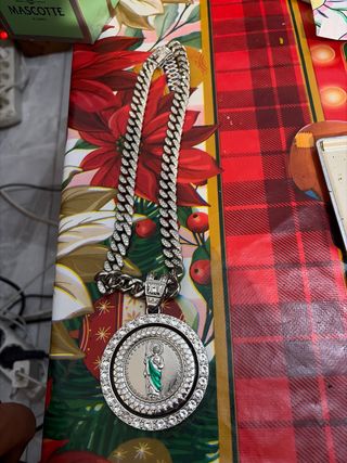 Collar con colgante de San Judas Tadeo. - Diseño circular con imagen de San Judas. - Borde adornado con circonitas. - Cadena de eslabones plateada.