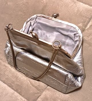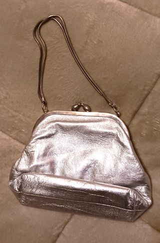Elegante bolso de mano para eventos especiales. Piel plateada. - Diseño metálico brillante. - Cierre de broche. - Cadena fina para llevar al hombro.