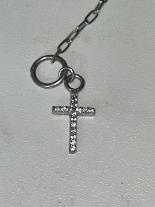 Elegante cadena de plata con un colgante en forma de cruz adornado con pequeñas piedras brillantes. Un accesorio delicado y con estilo. Precio negociable. - Material: Plata - Diseño: Cruz con incrustaciones de brillantes circonitas de la maxima calidad - Acabado: Brillante