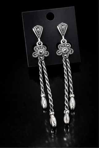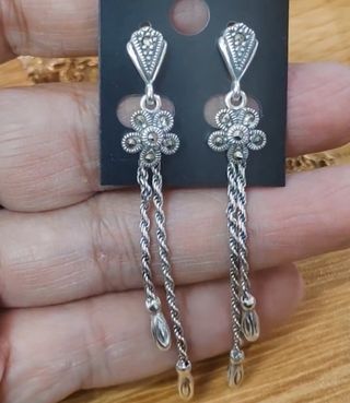 Elegantes pendientes de plata de ley 925 adornados con marquesitas. - Diseño floral detallado. - Cadenas colgantes con remates. - Estilo vintage y sofisticado.