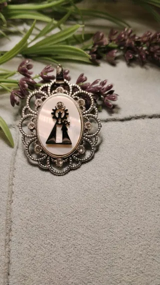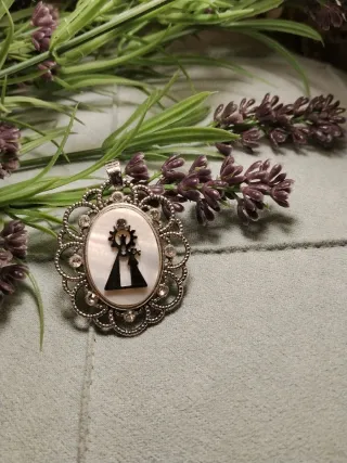 Colgante con diseño de la Virgen de los Desamparados, ideal para indumentaria fallera o huertana. - Detalle de la Virgen en el centro. - Marco ornamental con pequeñas incrustaciones. - Cierre para cadena.