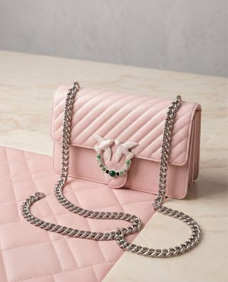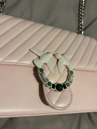 Bolso de mano o al hombro Pinko Love Bag con diseño acolchado V Quilt. - Color rosa pastel. - Cierre con el icónico logo de los pájaros. - Cadena metálica plateada. - Detalle de piedras verdes y blancas en el cierre. I present an icon of Italian style – the Pinko Love Bag in the most beautiful shade of powder pink. The bag is in perfect condition, with no visible signs of wear.