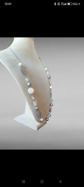 Elegante collar con un diseño de hojas plateadas y cuentas de varios tonos. Collar largo plateado combinando hojas caladas y cuentas de cristal piedras en tonos beige y simil perlas. Nuevo - Cuentas de diferentes tamaños y acabados. - Detalles en forma de hoja. - Cadena plateada.