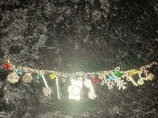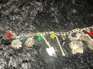 Pulsera inspirada en Stranger Things con varios dijes. - Dijes de brújula, hacha, cámara, pistola y bicicleta. - Cuentas de colores: rojo, azul, verde y amarillo. - Cadena de plata.