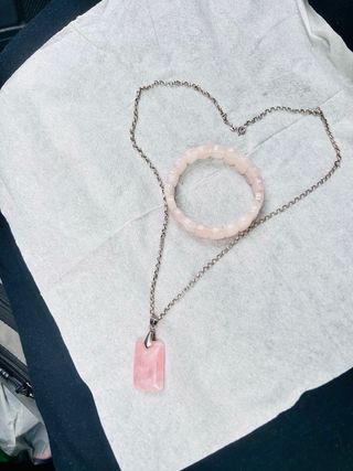 Elegante conjunto de bisutería con cuarzo rosa y detalles en plata. - Pulsera de cuarzo rosa. - Colgante rectangular de cuarzo rosa. - Cadena de plata.