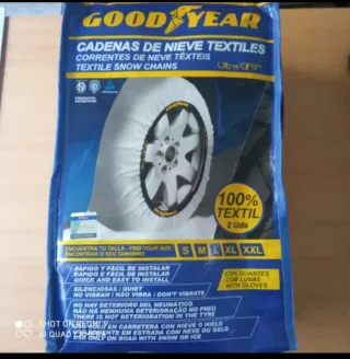 Cadenas textiles para nieve de la marca Goodyear, modelo Ultra GRIP. Son rápidas y fáciles de instalar, además de silenciosas y sin vibraciones. - Talla M - 100% Textil - Incluye guantes - No deterioran el neumático - Uso solo en carretera con nieve o hielo