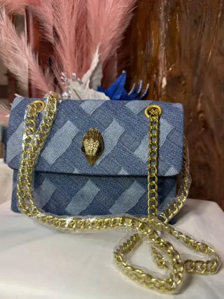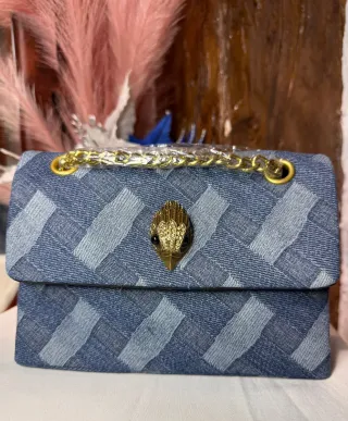 Bolso de mano con cadena dorada y diseño de rombos en tejido denim (vaquero) - Detalle de cabeza de águila con incrustaciones. - Cadena metálica dorada. - Cierre de solapa.