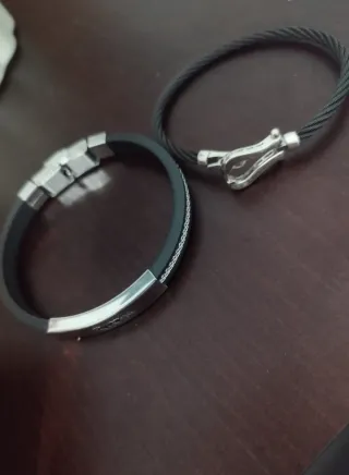 Conjunto de dos pulseras con un diseño moderno y elegante. - Pulsera de goma negra con detalles plateados y cierre de seguridad. - Pulsera de cadena negra con cierre de gancho en forma de cabeza de serpiente.