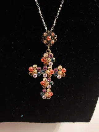 Elegante collar con cadena de plata y un colgante en forma de cruz adornado con cristales de colores. - Colgante de cruz con múltiples cristales.Fantasia - Cadena de plata. - Diseño con cristales tipo Swarovski.