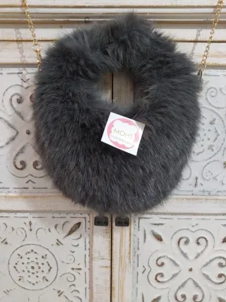 Bolso pequeño de pelo sintético en color gris, muy suave. Diseño redondo. Cierre con cremallera y forro tipo polipiel. Asa larga extraíble, tipo cadena, dorada para llevar al hombro o cruzado. También sirve como bolso de mano. Marca Soymohs. 🔖Nuevo, sin estrenar, con etiqueta
