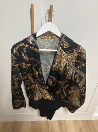 Body con un diseño llamativo y sofisticado. - Estampado de cadenas doradas y motivos de leopardo. - Corte cruzado en la parte delantera. - Manga larga. - Tejido con caída. - Parte inferior tipo braguita.