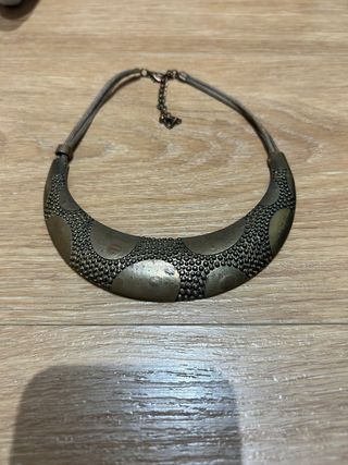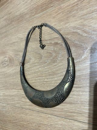 Collar de estilo étnico con acabado dorado. Es un accesorio llamativo que complementa cualquier atuendo. - Diseño curvo y ancho. - Textura con relieve y detalles de puntos. - Cadena ajustable para mayor comodidad.
