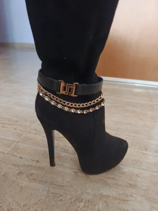 Botas de tacón con un diseño elegante y detalles brillantes. - Acabado con textura que capta la luz. - Adorno de cadena dorada en la parte superior. - Tacón grueso y plataforma delantera.