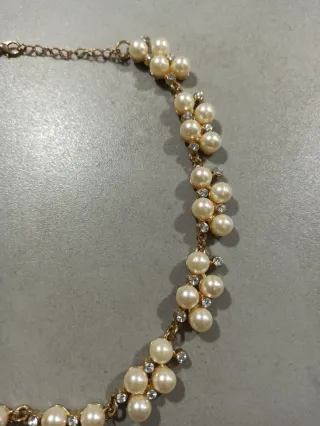 Elegante collar de bisutería con un diseño delicado. - Adornado con perlas de color blanco. - Detalles de pequeños cristales brillantes. - Cadena dorada. Apenas tiene uso.