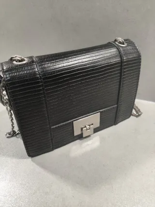 Bolso hombro Zara negro asa cadena dorada. Muy elegante. Buen estado solo algún eslabone ha perdido el dorado, se puede apreciar en foto. Medidas fotos.