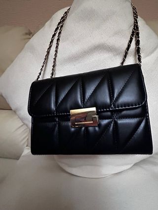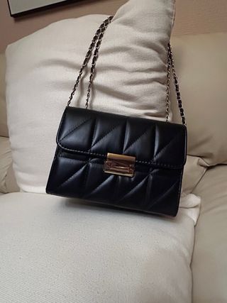Elegante bolso negro con un diseño acolchado y detalles dorados. - Asa de cadena metálica. - Cierre con broche dorado.