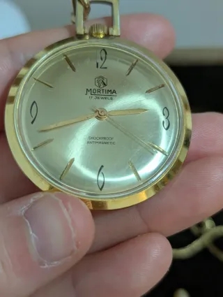Elegante reloj de bolsillo Mortima con cadena dorada. - Movimiento de 17 rubíes. - Mecanismo a prueba de golpes y antimagnético. - Caja y cadena en tono dorado.