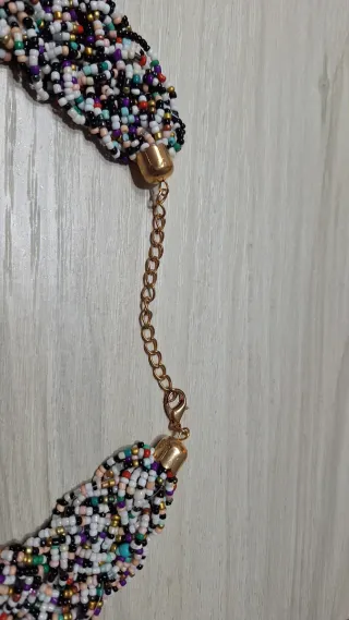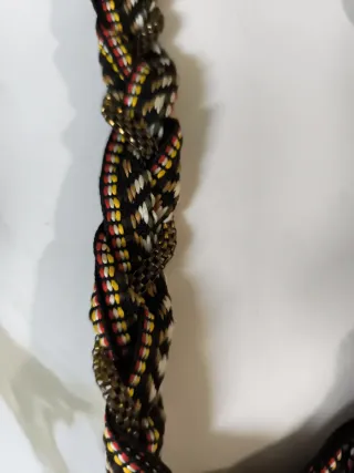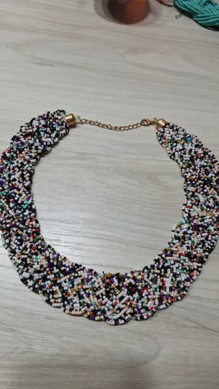 Collar llamativo con un diseño trenzado y adornado con múltiples cuentas pequeñas. - Diseño trenzado. - Acabado con cuentas de colores variados. - Cierre de cadena dorada.