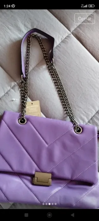 Bolso de mano para mujer con un diseño acolchado y moderno. - Color morado vibrante. - Asa de cadena metálica. - Cierre de solapa con broche dorado.