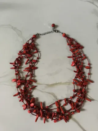 Elegante gargantilla de bisutería con un diseño único. - Elaborada con múltiples hilos. - Cuentas irregulares en tono rojo. - Cierre de cadena ajustable.